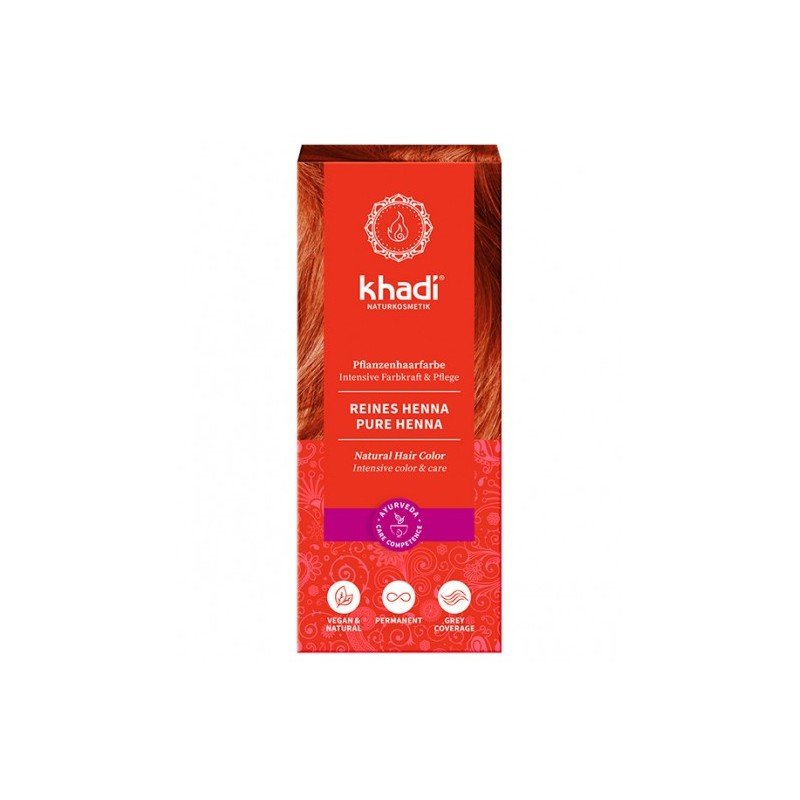 Henna natural Khadi, polvo puro de Lawsonia inermis, que proporciona un color cobrizo al cabello.